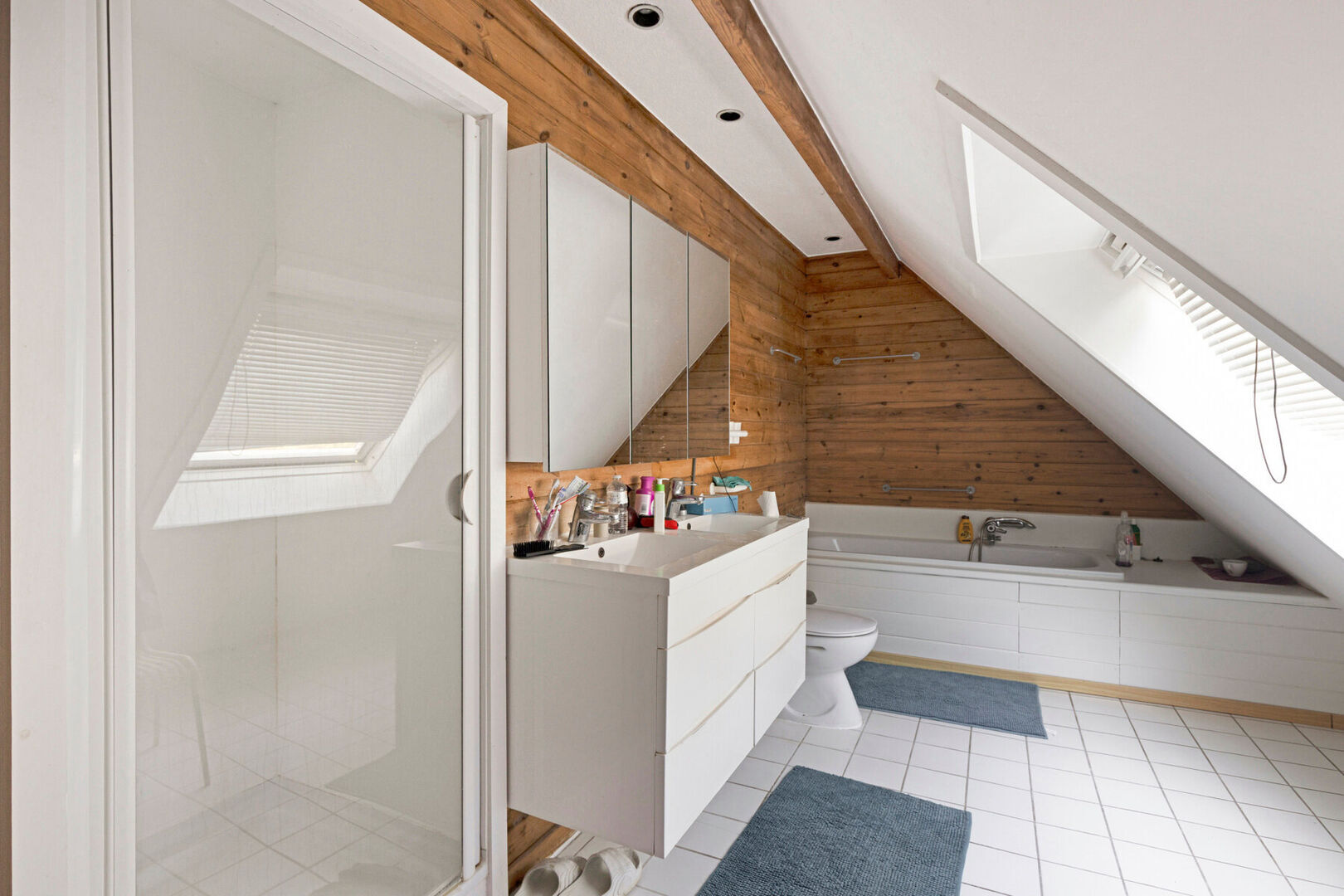 The first floor hosts 3 bedrooms and a bathroom with double sink, bathtub with shower screen, separate shower, and toilet.