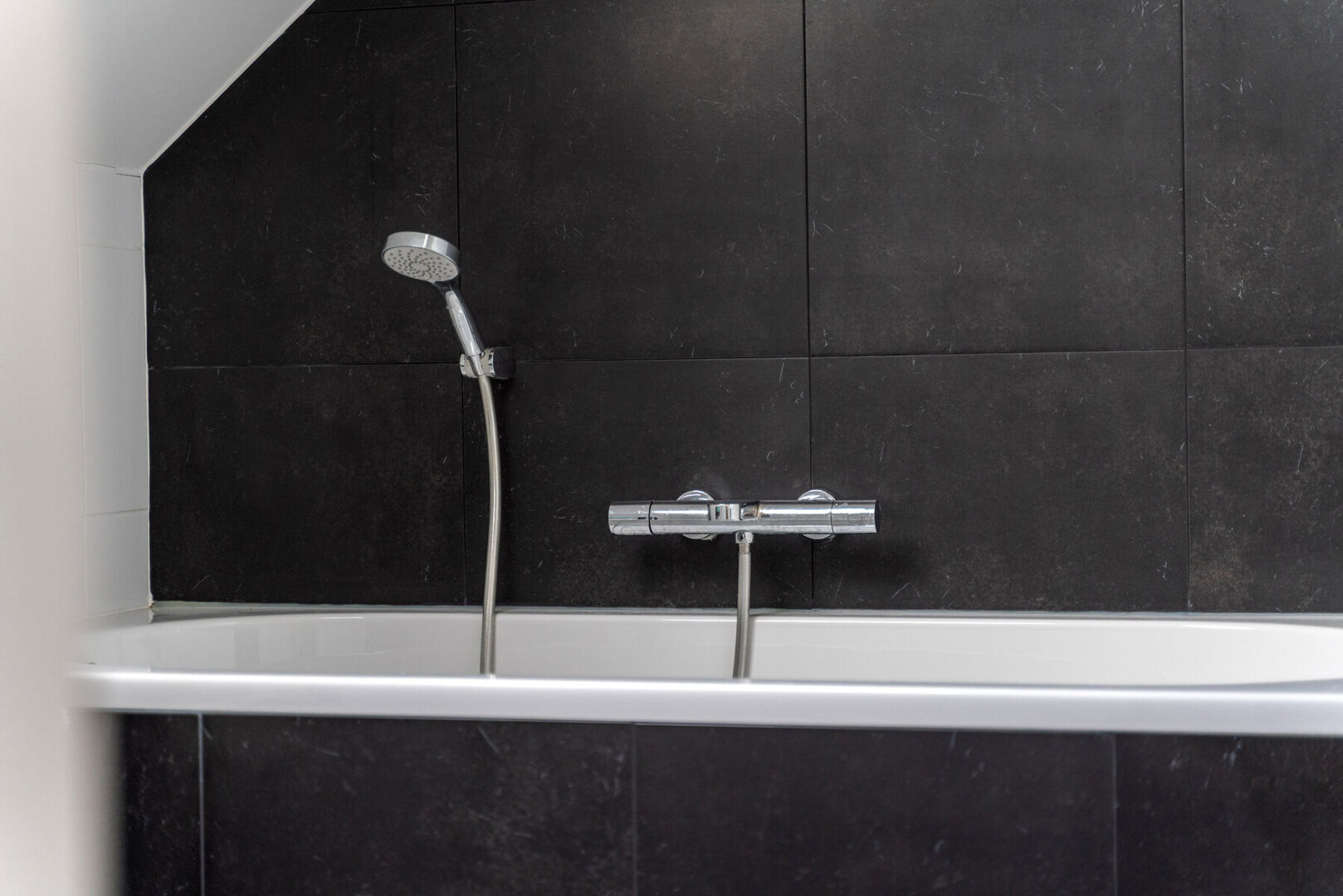 The office area provides access to the second floor, where you will find a third bedroom, an additional living space and a second bathroom with bathtub.