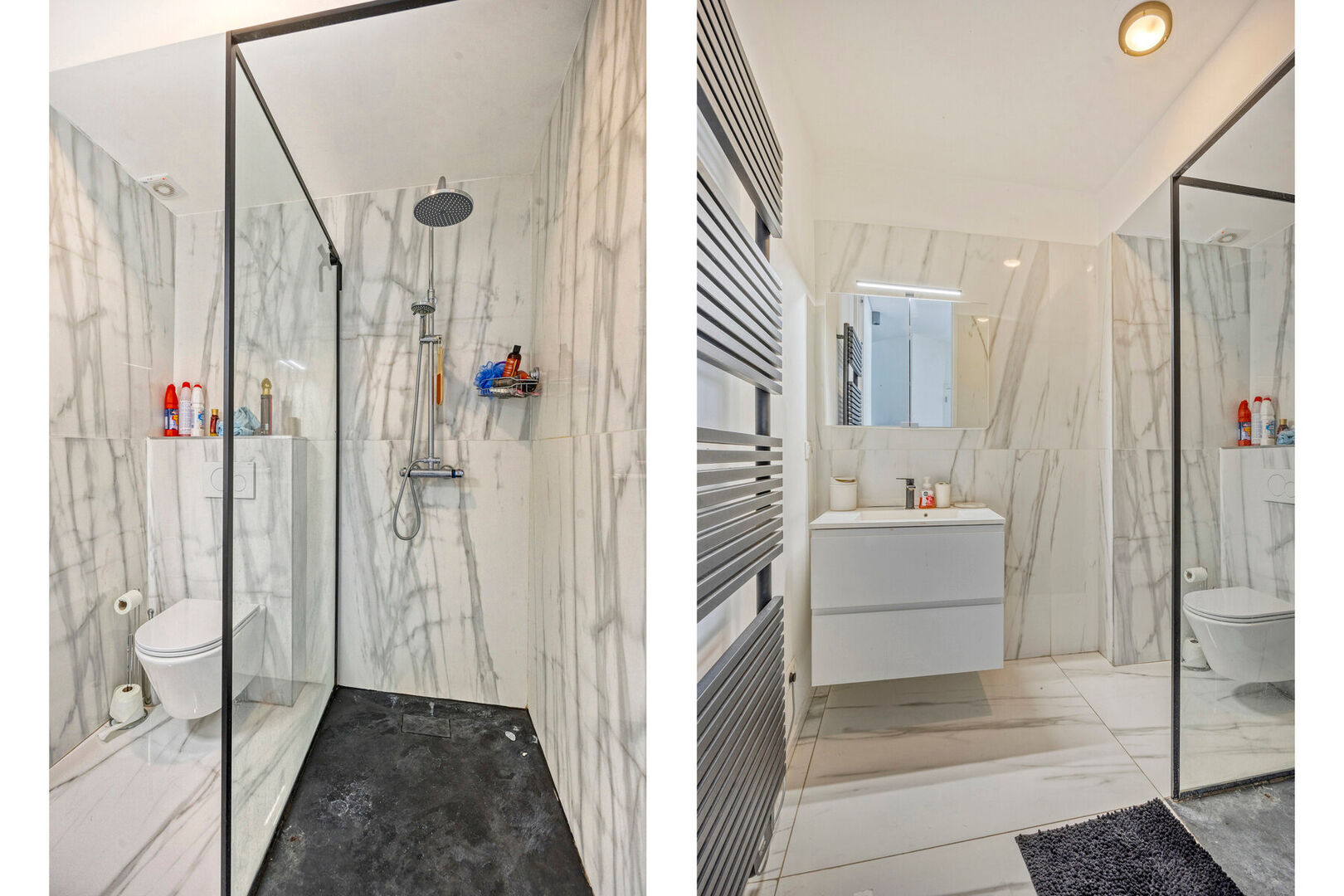 La salle de bains est entièrement carrelée et dispose d'une douche à l'italienne (douche à effet pluie et douchette), d'un meuble-lavabo, d'un WC et d'un sèche-serviettes électrique.