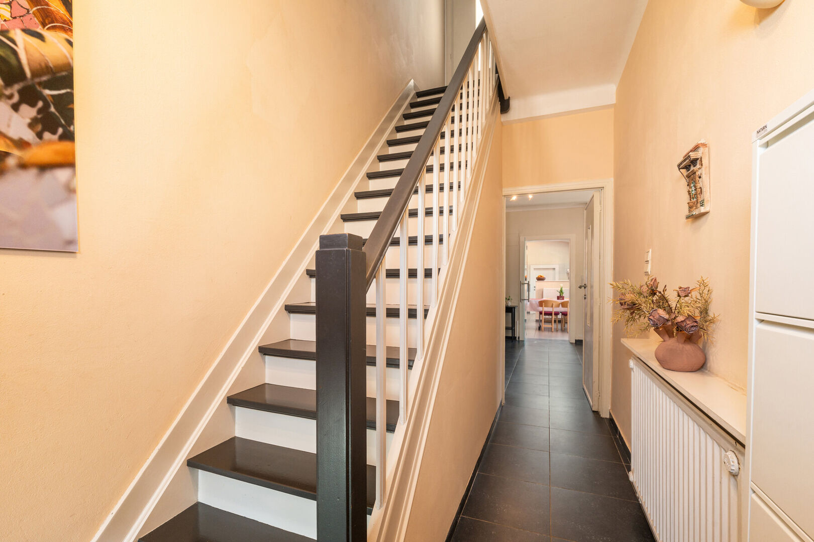 On accède à la maison par un hall d’entrée avec escalier. Depuis ce hall, on entre dans l’espace de vie composé d’un agréable salon et d’une salle à manger. Cet espace est aménagé avec un sol carrelé durable et bénéficie d’une belle luminosité.