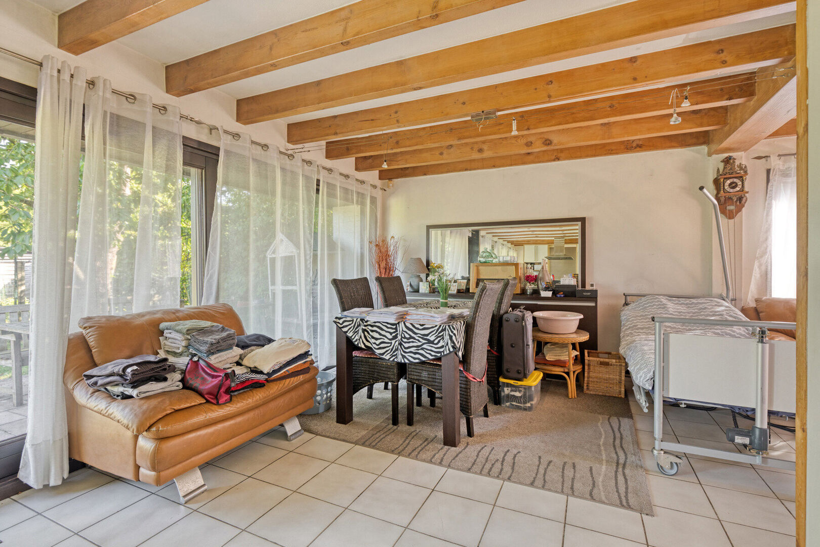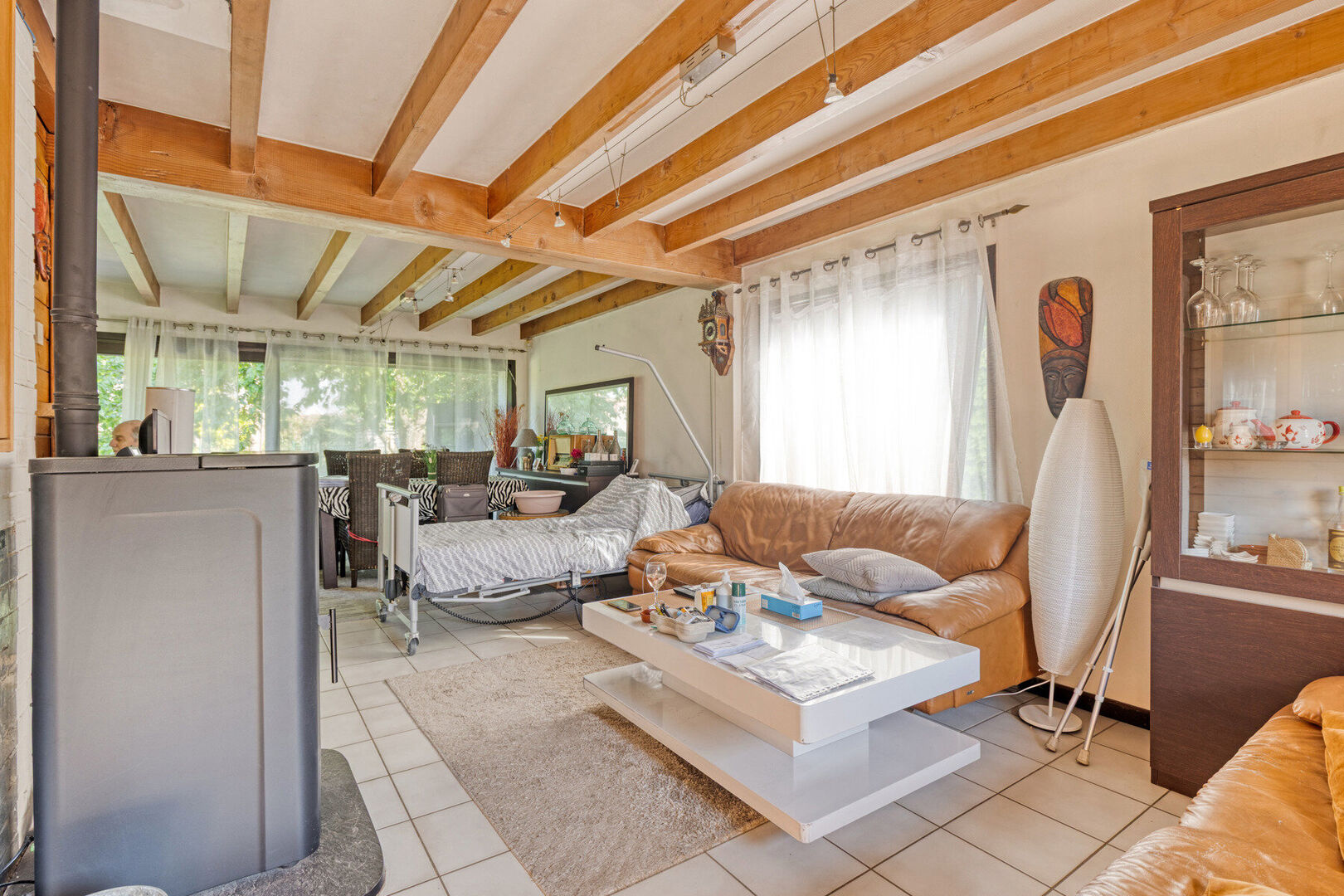 Le hall mène à un lumineux séjour avec de grandes fenêtres donnant sur le jardin orienté sud-est. Ce séjour est équipé d’un poêle à pellets convivial.