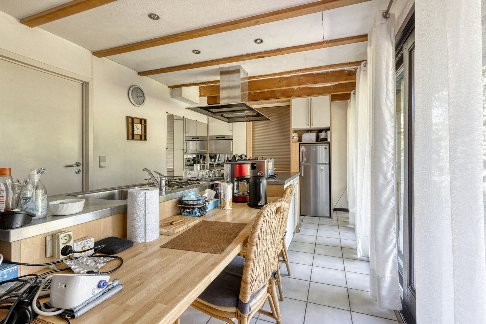 La cuisine ouverte est entièrement équipée : îlot de cuisson, four, four à micro-ondes, four vapeur, hotte et lave-vaisselle. Elle profite également d'une belle luminosité naturelle et d’une vue agréable sur le jardin.