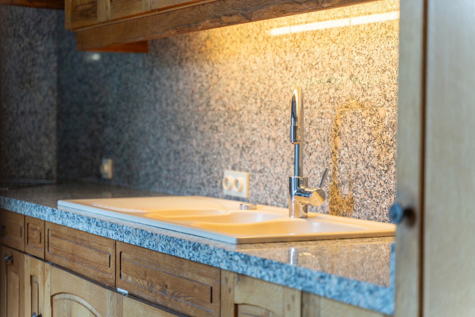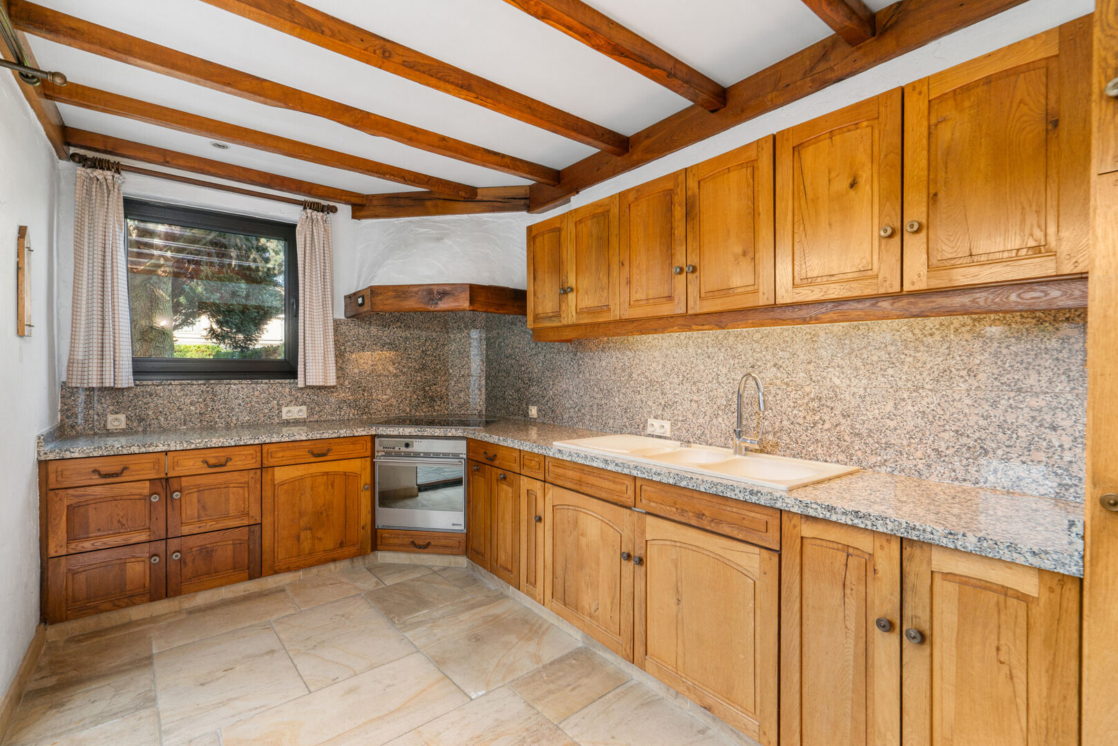 La cuisine, de style campagnard, est équipée d’armoires en bois massif, d’un plan de travail et d’une crédence en pierre naturelle.
