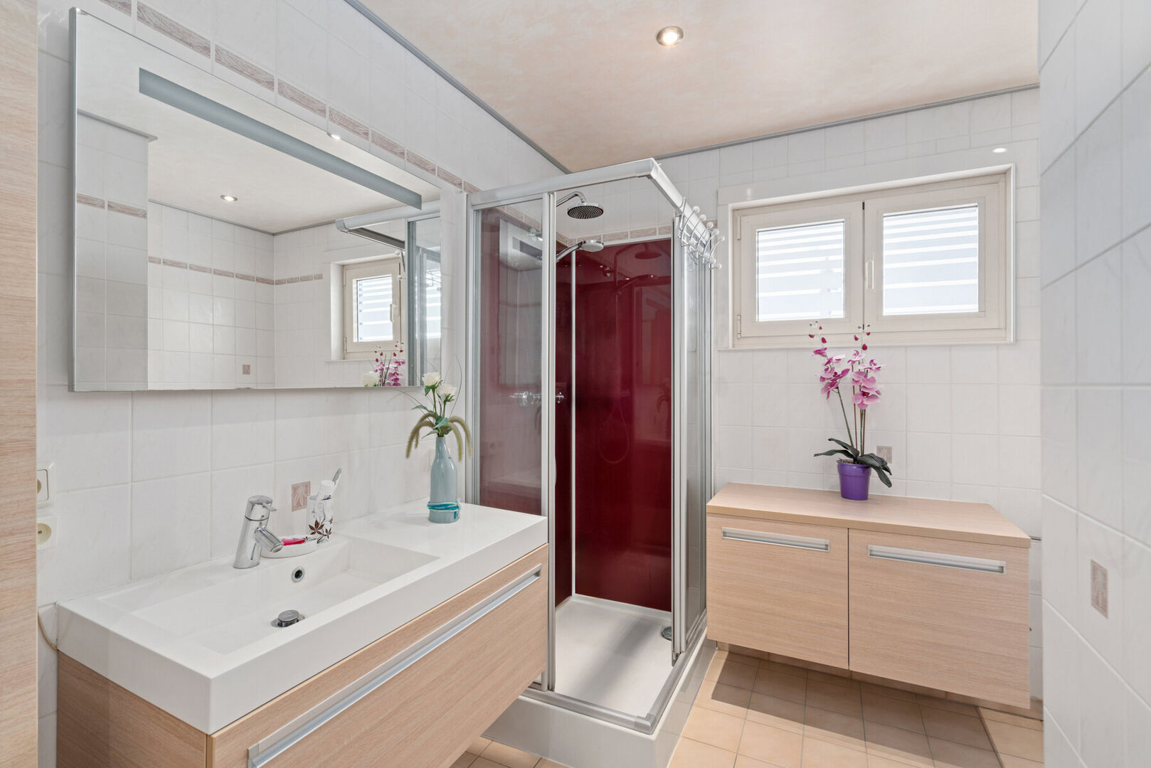 Au premier étage se trouvent 2 chambres, un espace bureau et une grande salle de bains avec baignoire, douche et meuble lavabo. Un raccordement pour machine à laver y est également prévu.