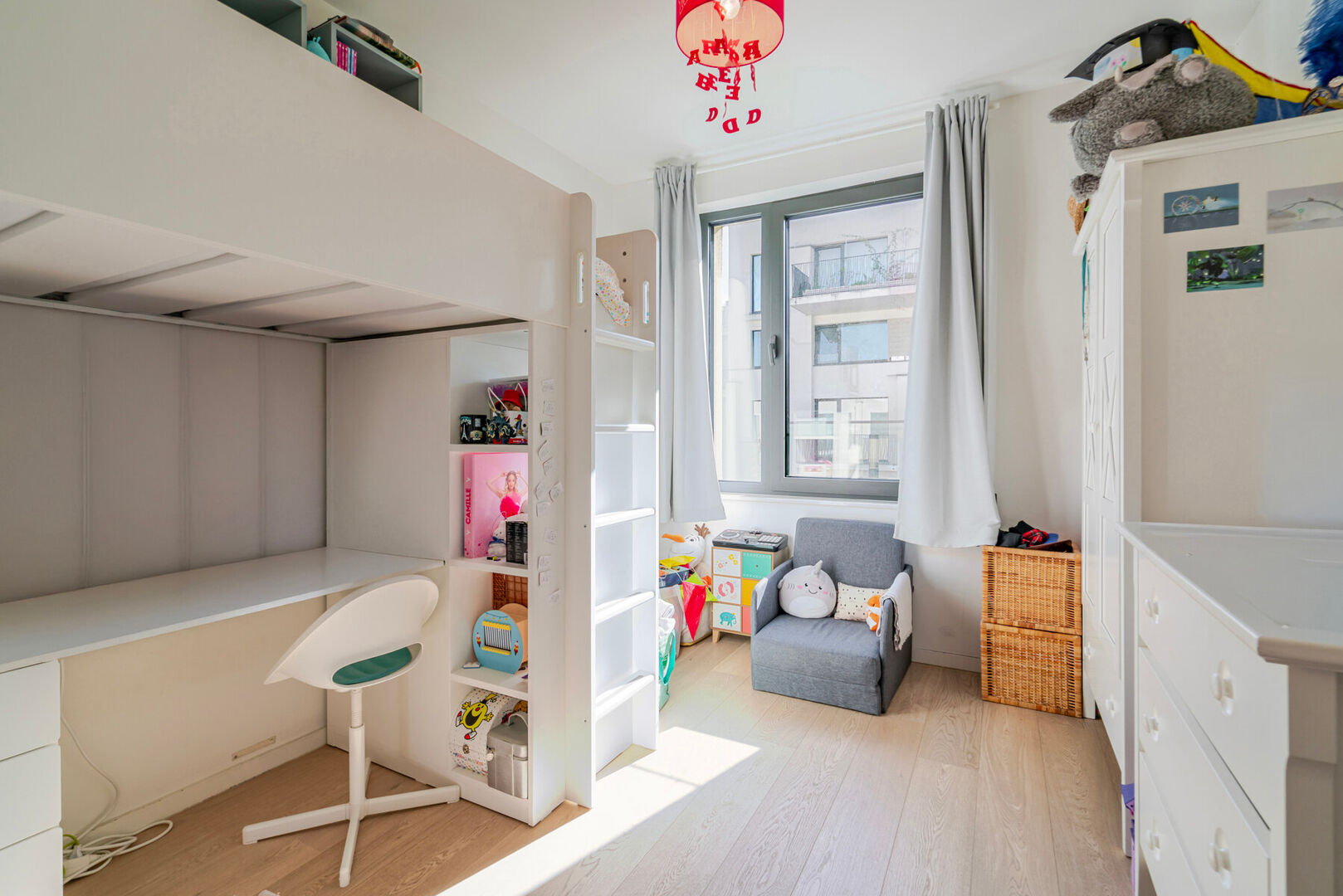 Op de eerste verdieping bevinden zich twee slaapkamers, waarvan de master bedroom toegang heeft tot een privatief terras. De badkamer is uitgerust met een dubbel badkamermeubel met twee wastafels, een brede spiegel en een moderne inloopdouche. Daarnaast is er een aparte wasruimte voorzien met plaats voor wasmachine en droogkast, evenals extra opbergmogelijkheden.